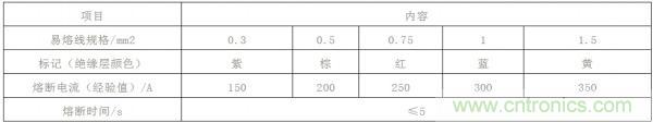 易熔線應有明顯的標志,當其熔斷后,其標志仍應存在以便于更換。易熔線的熔斷特性如表1所示。