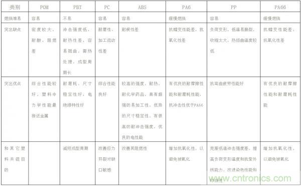 常用的材質主要有PA6、PA66、ABS、PBT、pp等,筆者總結了它們的具體性能差異,見表2。設計插件時可根據不同的需求選擇不同的材質,還可根據實際情況在塑料中添加阻燃或增強材料,以達到增強或阻燃的目的,如添加玻璃纖維增強等。