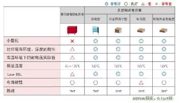多層陶瓷電容器和薄膜電容器同一電壓、同一容量的比較表。可知多層陶瓷電容器非常小型化。