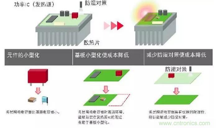 選擇多層陶瓷電容器,元件的小型化、元件貼裝位置自由度的提高使基板具有小型化和由于優越的耐濕性,而減少防濕對策的優勢。