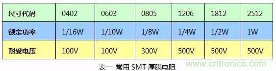 同樣,耐壓值選擇不合適的情況下,也會因為電阻被擊穿而導(dǎo)致系統(tǒng)設(shè)計的失敗。舉個例子:AC-DC開關(guān)電源模塊在設(shè)計的輸入前端,根據(jù)安規(guī) GB4943.1標準的要求,在保證插頭或連接器斷開后,在輸入端L、N上的滯留電壓在1S之內(nèi)衰減到初始值的37%,因此,在設(shè)計時一般會采用并接一個 或兩個MΩ級阻抗的電阻進行能量泄放,而輸入端是高壓,即電阻兩端是要承受高壓的,當(dāng)電阻的耐壓值低壓輸入端高壓的情況下,就會產(chǎn)生失效。以下表一是常見SMT厚膜電阻的參數(shù),最終選型時還要和選購器件的廠家核實。