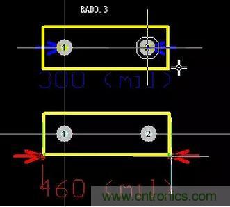 無極電容封裝以RAD標識,有RAD-0.1、RAD-0.2、RAD-0.3、RAD-0.4,后面的數字表示焊盤中心孔間距,如下圖所示(示例RAD-0.3)