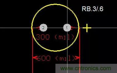 電解電容封裝則以RB標識,常見封裝有:RB.2/.4、RB.3/.6、RB.4/.8、RB.5/1.0,符號中前面數字表示焊盤中心孔間距,后面數字表示外圍尺寸(絲?。瑔挝蝗匀皇怯⒋纾缦聢D(RB-.3/.6):