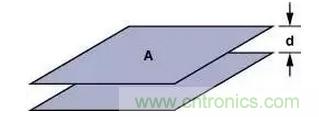 當尋找有問題的寄生源時,可能用得著幾個計算上述那些寄生電容尺寸的基本公式。公式(1)是計算平行極板電容器(見圖5)的公式。