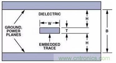 (6)H表示從接地平面到信號印制線之間的距離,W表示印制線寬度,T表示印制線厚度;全部尺寸均以密耳(mils)(10-3英寸)為單位。εr表示PCB材料的介電常數。