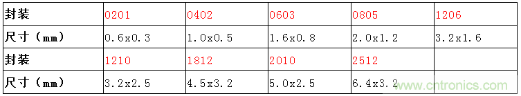 0201,0402,0603,0805,1206,1210,1812,2010,2512。