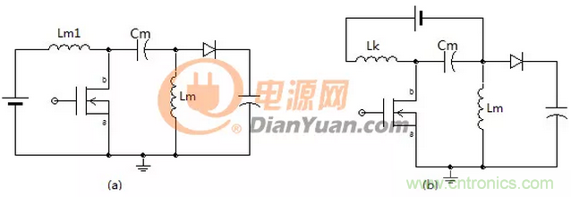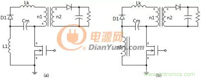 圖2中的兩個(gè)電路是一樣的只是形式不同,如果去掉電容Cm電路的左側(cè)就如同一個(gè)帶去磁繞組的正激變壓器初級(jí)側(cè),同樣這里的線圈n1、n3也要采用雙線并繞,如果兩線圈耦合的好二極管D1是可以省掉的,如果耦合的不好就會(huì)產(chǎn)生圖1中(a)的效果會(huì)有一部分無(wú)功損耗。