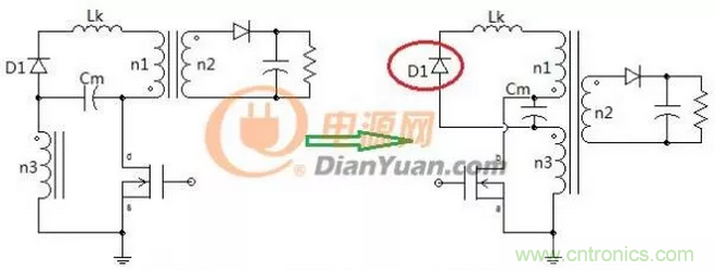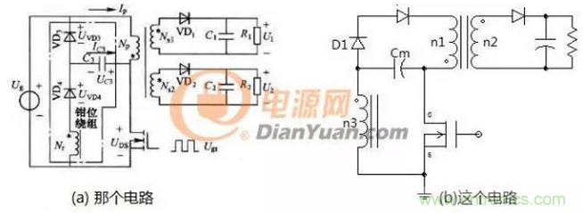 有一篇叫做“反激變換器繞組鉗位電路的設(shè)計(jì)與分析”的文章與這里的電路非常的相似。那個(gè)電路所具有的優(yōu)點(diǎn)也是這個(gè)電路的優(yōu)點(diǎn),從而驗(yàn)證了之前的理論和仿真結(jié)果。不過(guò)這里的電路有著更優(yōu)異的特點(diǎn),見(jiàn)下面兩個(gè)電路對(duì)比圖: