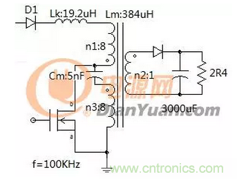 假設(shè)初級(jí)線圈耦合的比較好可以去掉原D1二極管,因漏感和電容會(huì)發(fā)生震蕩所以把D1串入到輸入端只為方便觀察波形。在有的應(yīng)用中反而要加大這個(gè)LC震蕩,比如QR模式的軟開(kāi)關(guān)。