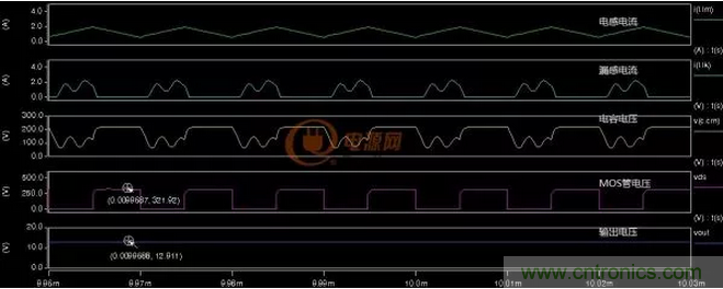 在上圖中漏感電流是斷續(xù)的,電容Cm的最大電壓200V左右,MOS管的Vds電壓321V左右。