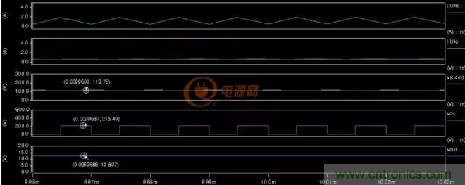 當(dāng)電容Cm增大后對(duì)漏感的吸收也變強(qiáng)了,此時(shí)漏感可以設(shè)計(jì)的大一些,上圖3-2中可以看到漏感的電流已經(jīng)為連續(xù)模式了(可去掉二極管D1),漏感電流亦既輸入電流,輸入電流連續(xù)可以提升電源的性能如果用于功率因數(shù)校正可以實(shí)現(xiàn)連續(xù)模式的反激PFC功能。圖中電容Cm的電壓鉗位在輸入電壓(113V)左右,MOS管的Vds電壓215V左右為輸入電壓+反射電壓(100V左右)之和,由此可推斷在高壓輸入300V時(shí)MOS管的Vds電壓為300+100=400V左右,MOS管可以選用低電壓型號(hào)的,電容Cm容量大了成本也會(huì)高這個(gè)可能需要權(quán)衡一下。