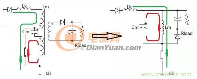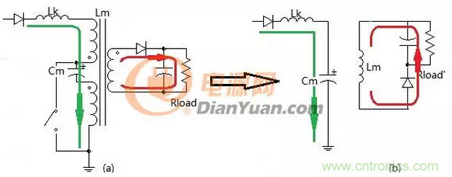 假設(shè)初級(jí)兩線圈耦合的好,當(dāng)開(kāi)關(guān)關(guān)閉時(shí)上圖中的(a)就等效于圖(b)其結(jié)果為主電感被免疫掉了,換言之電容Cm只吸收漏感能量不吸收主電感能量。