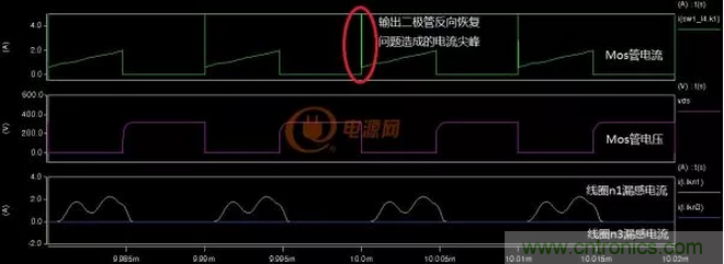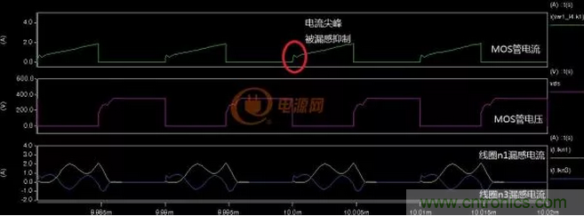 從圖4-2-4中可以看出增加的漏感Lkn3很好的抑制了電流尖峰,不過(guò)漏感Lkn3上的能量只能傳遞回電源形成無(wú)功功率,好在這部分能量不大無(wú)功損耗也就更小了。