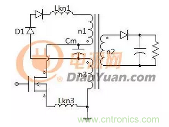 在前面圖2中初級(jí)線圈n1、n3是采用雙線并繞,在這個(gè)應(yīng)用中不采用并繞的方式或者是額外引入漏感使n1、n3線圈都寄生有漏感,電路如下: