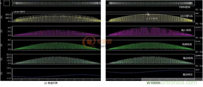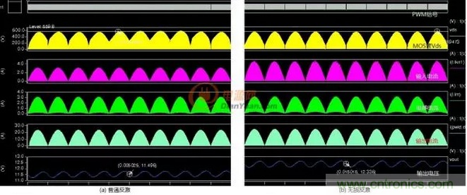 圖4-3-2:普通反激PFC與無(wú)損吸收PFC波形對(duì)比