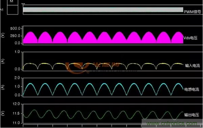 上圖中(a)普通反激電路Vds有尖峰電壓這是漏感造成的,圖(b)無(wú)損吸收則沒(méi)有這個(gè)電壓尖峰,而且只用了18nF的電容。兩種電路都采用的是臨界模式控制,輸入電流、輸出電流都是斷續(xù)的,輸出電壓上疊加有工頻紋波。