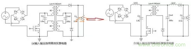 兩個(gè)電路的區(qū)別就在于二極管的接法略有不同,圖(b)這個(gè)電路能達(dá)到更高的效率而且可以實(shí)現(xiàn)軟開(kāi)關(guān)。