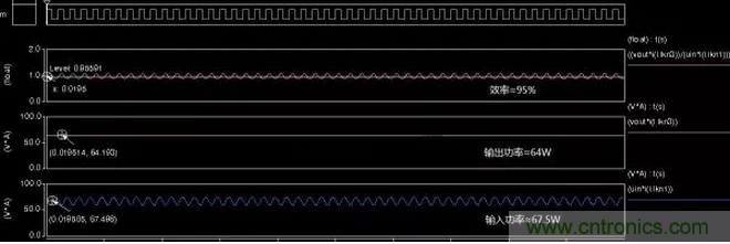 仿真的電路中二極管管壓降為0.3V元器件直流阻抗1m歐,忽略開(kāi)關(guān)損耗及磁芯損耗,從仿真結(jié)果看效率可以達(dá)到95%左右。