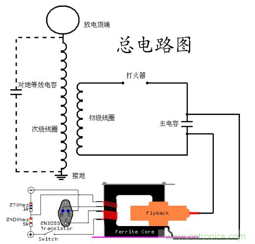SGTC的原理就是先給電容充電,電容的電壓達(dá)到一定程度時,在打火器出放出電弧,形成一個回路,然后放電,之后重新開始這個循環(huán)。