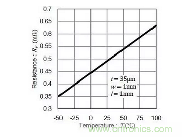 因此,當3A電流在25°C時流通PCB表面上銅時,電壓降約24.5mV。然而,溫度上升至100℃時,電阻值增加29%,電壓降變為31.6mV。