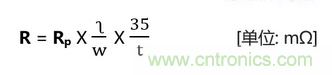 此外,如果知道每單位面積銅的電阻值Rp在不同溫度下的變化(如下圖資料所示),可以使用以下公式估算整個銅的電阻值R。注意下圖銅的尺寸是:厚度(t)35μm,寬度(w)1mm,長度(?)1mm。