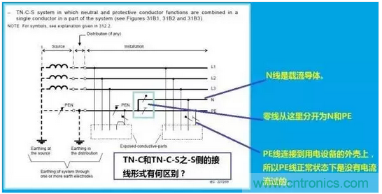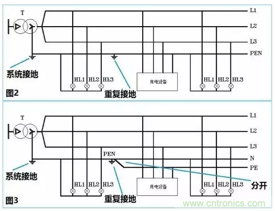 注意哦,圖2對應的接地系統叫做TN-C,而圖3對應的接地系統叫做TN-C-S。