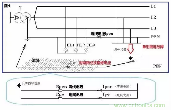再看圖3,我們發現保護性中性線PEN中采取多點接地的方法,以避免出現保護性中性線斷裂點后部電壓上升的情況。