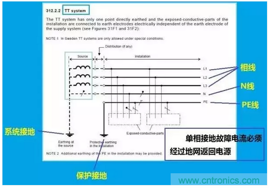 知曉這幾個概念后,我們來看看IEC給出的有關TN-C和TT系統的原圖。注意,這兩幅圖是不容置疑的,是有關接地系統的權威解釋。