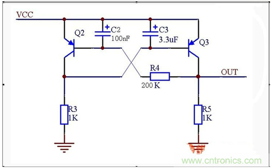 C2和c3很重要,在自鎖后,重啟電路就靠這兩個電容,否則啟動失敗。原理是上電時,電容兩端電壓不能突變,C2使得Q2基極在上電瞬間保持高電平,使得Q2不導通。C3則使得上電瞬間Q3基極保持低電平,使得Q3導通Vout有電壓。這樣R5位高電平,鎖住導通。