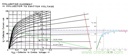這里理解起來有些抽象,那我就具體的畫個圖,就很好理解了。在三極管截止的時候CE兩端的電壓是最大的,我們設為4.5V,在IB逐漸加大的過程中,VCE在逐漸變小,而飽和狀態下的Ic是由RC決定的,請看圖: