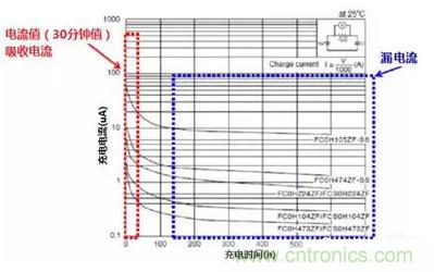 圖1中顯示了KEMET公司“FC系列”產品在室溫下的漏電流特性和測量電路。當超級電容器充電時,存在穩(wěn)定的寄生電流(Parasitic Current)。超級電容器通過離子“吸收”和“釋放”造成充電,并且當離子試圖到達活性炭的細孔內部時,充電開始時的寄生電流很高。該初始電流稱為“吸收電流”。該充電電流隨著時間的推移而減小,并且隨著時間的推移變得穩(wěn)定。在開始施加電壓30分鐘后的主電流分量是吸收電流。當吸收電流減小時,漏電流成為主要成分。