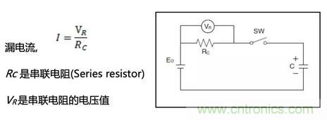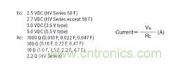除了部份生產商直接提供參數(shù)值外,“漏電流值”可通過向超級電容器施加電壓直至特定時間后測量電阻器兩端的電壓,再根據(jù)以下簡單方程計算便能得出。