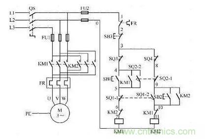 這個電路也很經典,其實它是控制電機正反轉的加強版。利用行程開關實現自動往返的效果,按下SB1啟動按鈕KM1自鎖,小車開始正向走,當碰到限位開關SQ1時,KM1線圈失電KM2自鎖,小車又反向運行。只要不按下SB3這個停止按鈕,它就會循環運行。