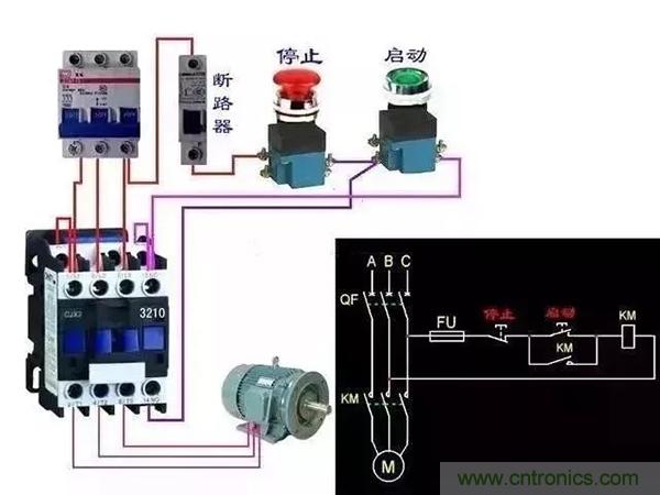 明白了實物接線以后我們再看電路圖就很容易理解了,右方是接觸器自鎖電路圖,ABC分別電表三相火線電源,QF開關,KM是接觸器,FU是熔斷器,KM帶個方口就是接觸器線圈電源,按鈕的位置,連在一起的是要接常閉,分開的是要接常開,圓圈M 是負載電動機,根據實物接線圖再結合自鎖電路圖!