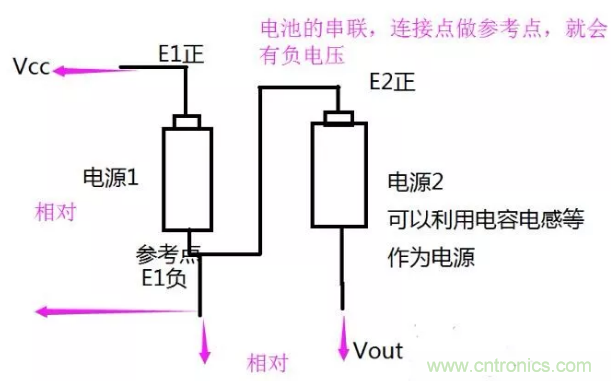 想產生負電壓,就讓他相對于電源負極的電勢更低即可。要想更低,必須有另一個電源的介入,根本原理都是利用兩個電源的串聯。電源2正極串聯在參考電源1的負極后。電源2負極就是負電壓了。