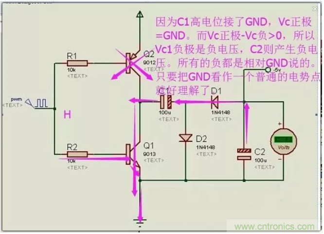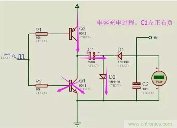 3、電容C1作為電源,C1高電勢極串聯在參考點。C1放電,從C2續流,產生負電壓。
