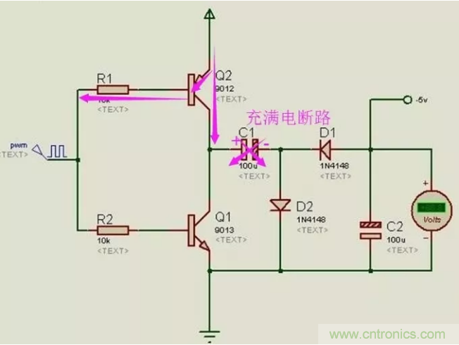 當PWM為低電平時,Q2關閉,Q1打開,C1開始放電,放電回路是C1-C2-D1,這實際上也是對C2進行充電的過程。C2充好電后,下正上負,如果VCC的電勢為5點幾伏,就可以輸出-5V的電壓了。