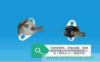 溫度開關的額定電流值(雙金屬片間流過電流值)一般有1A、2A、5A三個等級。溫度開關常見的封裝形式有塑封片狀、金屬殼長條形等,其在電炒鍋、電餅鐺、電烤箱等電熱炊具中被廣泛使用;而在軟啟動器、變頻器、逆變式焊機等工控設備中,溫度開關多被固定在大功率元件(晶閘管、IGBT)背后的鋁制散熱片上;此外溫度開關還會被植入電動機、大容量變壓器繞組內,充當超溫預警、溫度保護元件。