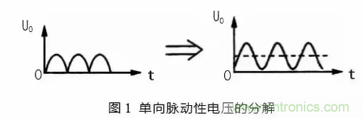 如圖 1(a)所示。是單向脈動性直流電壓波形,從圖中可以看出,電壓的方向性無論在何時都是一致的,但在電壓幅度上是波動的,就是在時間軸上,電壓呈現(xiàn)出周期性的變化,所以是脈動性的。但根據(jù)波形分解原理可知,這一電壓可以分解一個直流電壓和一組頻率不同的交流電壓,如圖 1(b)所示。在圖 1(b)中,虛線部分是單向脈動性直流電壓 U。中的直流成分,實線部分是 UO 中的交流成分。