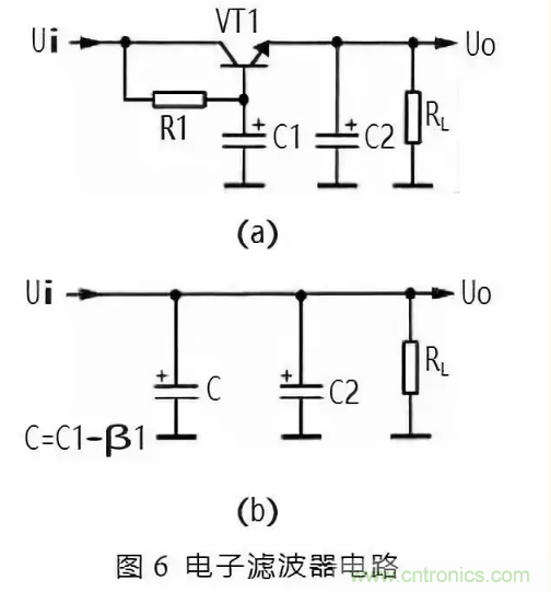 圖 6 所示是電子濾波器。電路中的 VT1 是三極管,起到濾波管作用,C1 是 VT1 的基極濾波電容,R1 是 VT1 的基極偏置電阻,RL 是這一濾波電路的負載,C2 是輸出電壓的濾波電容。