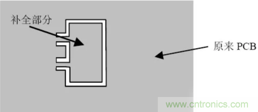 不規(guī)則形狀且沒(méi)拼板的PCB 應(yīng)加工藝邊。若PCB 上有開(kāi)孔大于等于5mm×5mm的地方,在設(shè)計(jì)時(shí)要先將孔補(bǔ)全,以避免焊接時(shí)造成漫錫和板變形,補(bǔ)全部分和原有的PCB 部分要以單邊幾點(diǎn)連接,在波峰焊后將之去掉(見(jiàn)圖3.2)