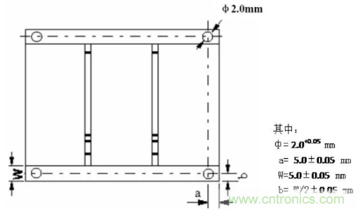 在拼板外框的四角開(kāi)出四個(gè)定位孔,孔徑4mm±0.01mm;孔的強(qiáng)度要適中,保證在上下板過(guò)程中不會(huì)斷裂;孔徑及位置精度要高,孔壁光滑無(wú)毛刺。