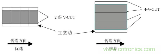 拼板方向應(yīng)平行傳送邊方向設(shè)計(jì), 當(dāng)尺寸不能滿足上述拼版尺寸要求的例外。一般要求“V-CUT”或郵票孔線數(shù)量≤3(對(duì)于細(xì)長(zhǎng)的單板可以例外),見(jiàn)圖3.4。