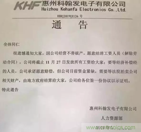 不僅僅是韓國LG因銷量下滑關閉PCB業務,就在前幾日,PCB廠商惠州科翰發電子發出破產公告。公告稱,由于公司經營不善導致破產,和員工解除勞動合同并結清工資,將于11月27日發放薪資給大家,通告中特別說明公司愿意賠償給需要經濟補償金的人員,只是由于公司資金緊缺,公司會和員工簽一份證明協議,待法院拍賣公司財產后由地方政府結算,也算是給員工一個交代。