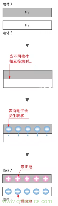 當兩個不同物體相互接觸時,表面電子就會發生轉移。獲得電子的一端帶負電,失去電子的一端帶正電。