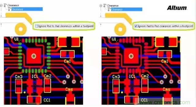 用此選項勾選非常簡便。不需要原來那樣用Query語句InComponent(''U1'') ,然后設置其最小安全間距為6mil,并設為最高間距優先級.