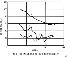 EMI濾波器能有效抑制單片開關(guān)電源的電磁干擾。圖4中曲線a為不加EMI濾波器時開關(guān)電源上0.15MHz~30MHz傳導(dǎo)噪聲的波形(即電磁干擾峰值包絡(luò)線)。曲線b是插入如圖3(d)所示EMI濾波器后的波形,能將電磁干擾衰減50dBμV~70dBμV。顯然,這種EMI濾波器的效果更佳。