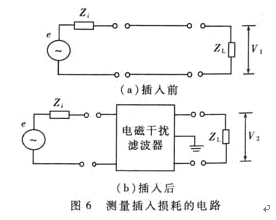 假定負(fù)載阻抗在插入前后始終保持不變,則P1=V12/Z,P2=V22/Z。式中V1是噪聲源直接加到負(fù)載上的電壓,V2是在噪聲源與負(fù)載之間插入電磁干擾濾波器后負(fù)載上的噪聲電壓,且V2<<V1。代入(1)式中得到