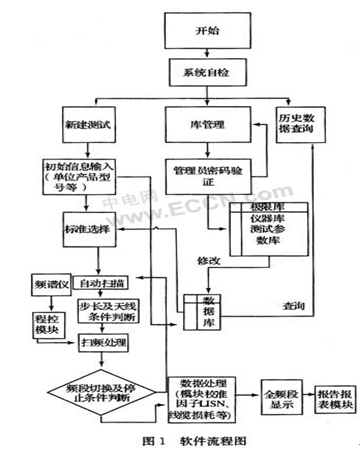 b.軟件構成及功能:本軟件功能采用模塊化方法實現主要由界面參數輸入及數據顯示模塊、數據庫管理模塊、程控及自檢模塊、報告報表模塊組成。本EMI標準自動測試軟件具備以下功能:①參數設置,包括測試標準的選擇,測試配置的提示,測試參數的設置,如測試頻段、測量帶寬、檢波方式、掃頻步進量、參考電平、分辨率帶寬、掃頻方式、傳感器系數、電纜損耗、衰減/放大器等;②控制儀器(頻譜分析儀)以一定的步長和速率對信號進行掃頻測量、判別和讀出數據;③數據處理能力.電磁輻射自動測量軟件能夠自動將測量的信號電壓轉換成干擾的量值,即自動補償因傳感器的使用而引起的隨頻率變化的校準系數,并可用線性或對數頻率坐標顯示出信號的頻率分布,同時自動與相應極限值進行比較,判別信號是否超標并在圖中表示出信號頻譜與極限值的關系;④數據的存儲和輸出能力,軟件可以將每次的測量數據以數據庫文件的形式進行保存,需要時提取,特別是傳感器系數和測試極限值都以數據文件的形式保存,便于數據處理和查詢時調用。⑤數據庫管理功能。主要對各標準的極限值,天線校準因子等進行數據管理。系統工作流程圖如圖1所示。