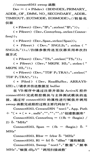 程控及系統自檢模塊均由VC++以控件形式實現。由于本系統使用的是NI公司的GPIB總線實現通信所以在VC++編程環境中,通過調用GPIB32.dll動態連接庫使用其內部函數完成通信,儀器指令參照HP 8563EC編程指令編制主要代碼如下: